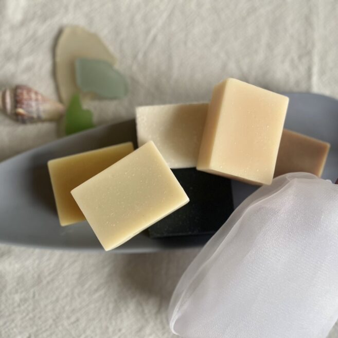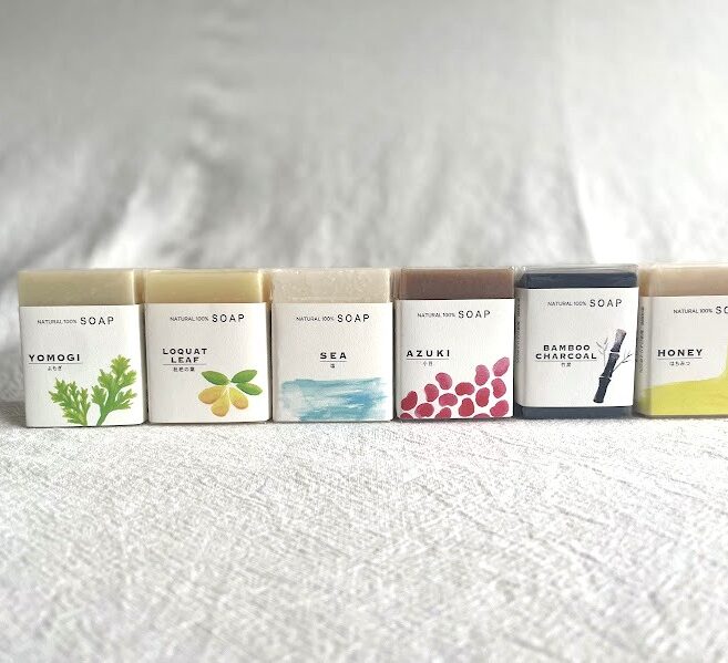春はヨモギのエキスや蜂蜜&マヌカ油配合の石けん、夏は竹炭や塩、秋には小豆、冬には枇杷の葉…。